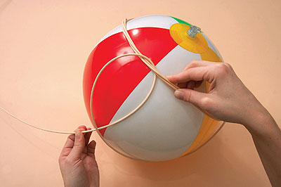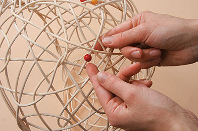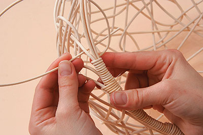 Fújjuk fel a labdát, és egy szál nádat kétszer-háromszor körbetekerve készítsünk akkora gyűrűt, amelyet ráültethetünk a gömbformára. A kilógó száldarabot hajlítsuk a labda alá, és az ellenkező oldalon bújtassuk át a kezdkoszorú szálai között (2a.). Addig ismételjük ezt a műveletet, kusza vezérszálakat hajlítva a kosárnak, amíg a szál tart.
