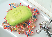 Egy-két tarka kiegészítő is sokat javít a legegyszerűbb, fehér csempés fürdő látványán. Főleg akkor, ha még egy kis játékosságot is viszünk a dologba.