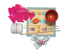 A mellékletből kimásolt és kivágott íves négyszög körvonalát rajzoljuk fel a cserépre, és fessük ki fehér akrilfestékkel. Vágjuk ki a négyszögformát a virágmintás szalvétából is, és dekupázsragasztóval simítsuk fel pontosan a fehér részre.