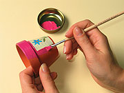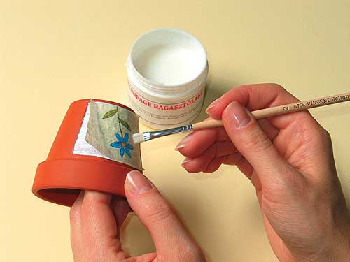 A viasszal megegyező színű akrillal fessük be a szalvéta körül a cserepet és a perem belsejét. A cserép alján lévő lyukat tapasszuk be egy kis gyurmával kívülről, hogy a viasz ne folyhasson ki.