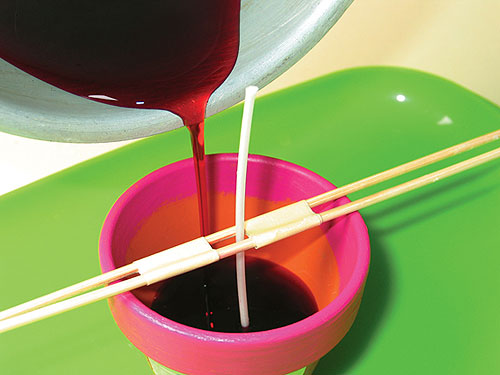 Állítsunk a cserépbe egy talpas kanócot, és támasszuk meg két hurkapálcával, hogy biztosan függőleges maradjon öntés közben. A vízfürdőben felolvasztott viasszal először csak 2/3-ad részig öntsük fel a cserepet. (Mikor a viasz dermed, a közepe beszívódik, homorú lesz, ezért szükséges két részletben önteni.) Távolítsuk el a hurkapálcákat, és töltsük fel viasszal a cserepet a pereméig.