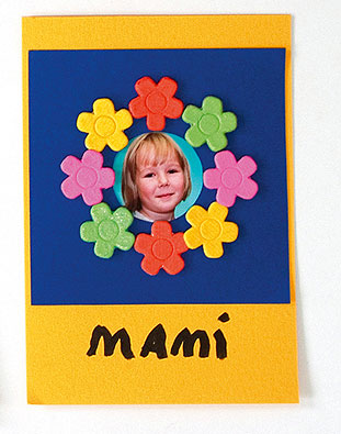 Az óvodai, iskolai fotózás alkalmával a gyerekekről általában igazolványkép is készül; ezzel egészen személyessé tehetjük ezt az üdvözlőlapot. Egy 10×10 cm-es négyzet közepéből vágjunk ki a fotó méreténél kisebb átmérőjű kört. (Ne a fotót vágjuk körbe!) A kapott „keretet” ragasszuk a fotóra, az egészet pedig a lapra. A fotó köré 3D kockákkal ragasszunk kartonvirágokat, amelyeket előzőleg lakkfilccel vagy temperával tarkára is színezhetünk.