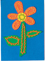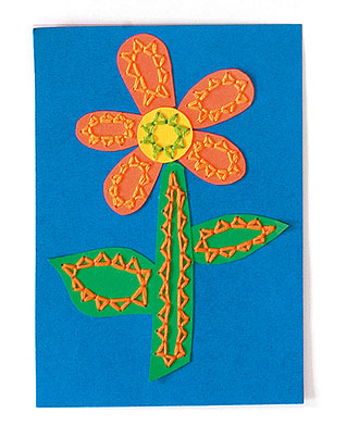 Vágjuk ki a virág elemeit – szirmokat, közepet, szárat és leveleket – színes kartonból, és kevés ragasztóval nyomjuk a helyükre, a kártyaalap elejére. (Így a varrásnál nem mozdulnak majd el.) Az öltések helyét varrás előtt vastag tűvel lyukasszuk át. Először cikcakköltéssel varrjuk ki a fogazatot, majd belül hátraöltéssel haladjunk végig a minta mentén. A szálvégeket ne csomózzuk, hanem ragasztószalaggal rögzítsük a hátoldalon. Ha kicsit “kuszára” sikeredett a varrás visszája, ragasszunk egy kartonlapot a képeslap hátoldalára.
