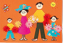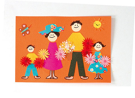 Vágjuk ki a ruhadarabokat és a fejeket színes kartondarabokból, rendezzük el a lapon, és ragasszuk fel. (A ruhák és a nadrágok is egy-egy háromszög formából készülnek, amelyek csúcsát, közepét lenyisszantjuk, illetve ívesre vágjuk.) Filctollal rajzoljuk meg az arcokat, a lábakat és a frizurákat. A készen kapható papírpillangót, napocskát és virágokat ragasszuk a helyükre. Ha kissé kiemelkedő díszeket szeretnénk, ragasszunk alájuk 3D kockákat.