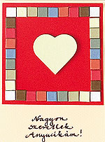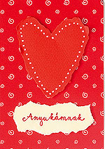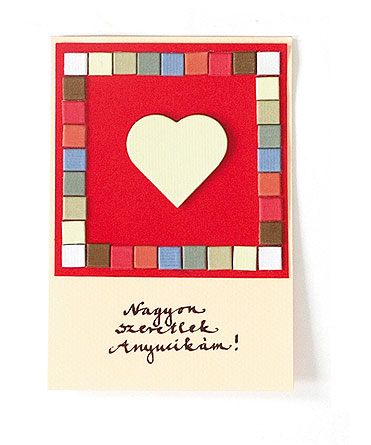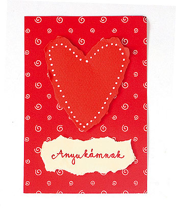 Egy piros, egyszínű kartonra felrajzolt szívformát apró mozdulatokkal tépdessünk körbe a vonal mentén, majd fehér lakkfilccel pöttyözzük a kontúrt. Krémszínű kartonból tépdessük ki hasonlóan a felirat alapját, írjuk fel a szöveget, és ragasszuk fel a kártyaalapra. Ha térhatású képeslapot szeretnénk, ragasztóstift helyett használjunk 3D-s szivacskockákat.
