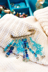A bross elkészíthető otthon fellelhető, maradék gyöngyszemekből is, vagy régi nyakláncok elemeiből. A képen látható kék kiegészítőhöz nyakék is fűzhető, amelynek részletes leírása a Praktika Magazin májusi számában található.