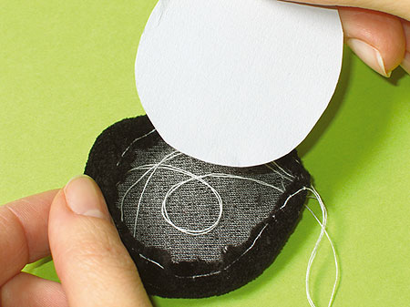 A fenéklap sablonja szerint, ráhagyás nélkül vágjunk a kartonpapírból egy korongot. A testhez hasonlóan a plüss fenéklapot is varrjuk körbe, nagy öltésekkel, két sorban. A két felső szálat megfogva, ráncoljuk be az anyagszélt, csúsztassuk belülre a kartonpapírt, és a cérnákkal húzzuk teljesen szorosra a peremet.