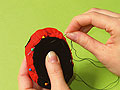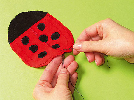 Ráncoljuk össze a test szélét, és tömjük ki a katicát vatelinnel. Gombostűzzük rá a kemény feneket, közben igazítsuk a test bőségét a fenéklapéhoz, és rejtett öltésekkel varrjuk össze körben a széleket. A szárnyak hosszanti felezőjének és a fej vonalának metszéspontjában alulról öltsünk fel, majd nem sokkal mellette vissza. Húzzuk meg és varrjuk el a cérnát úgy, hogy egy kis mélyedés keletkezzen a fej és a test találkozásánál. Varrjuk gyűrűvé a gumit, és kézzel öltögessük a katicát erre a varrásvonalra. (Ha keskenyebb gumival dolgozunk, két csíkot varrjunk össze cikcakköltéssel.) Fűzzünk a drótra 5 szem gyöngyöt, bújtassuk vissza a drótvéget az első gyöngyszem mögé, szúrjuk be a drótot az egyik csáp helyére, majd bújtassuk ki a másiknál, és fűzzünk ide is 5 szem gyöngyöt, végül ezt a drótvéget itt is bújtassuk vissza.