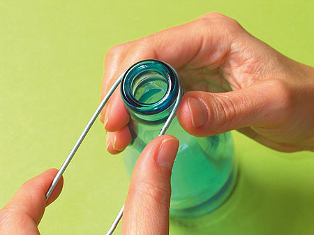 A mellékletben található minta alapján hajlítsuk meg a drótot gemkapocs alakúra. Javasoljuk, hogy az íveket egy ásványvizes üveg szájára hajtva formáljuk meg. (A gemkapcsot elkészíthetjük ruhatisztítóban kapott fém vállfából is. Csípjük le az akasztórészt, egyenesítsük ki a drótot laposfogóval, majd vágjuk le belőle 40 cm-t.)