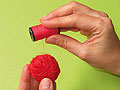 Fűzzünk kb. 30 cm piros cérnát a tűbe. A katica testét apró öltésekkel varrjuk a gemkapocs felső ívéhez. Ragasszuk fel a nagyobb fekete pompont fejnek, a két kisebbet pedig a katica hátára pöttynek.