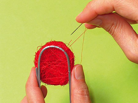 Tépjünk a szizálgyapjúból egy nagyobb diónyit és formáljuk a köteget tojás alakúra, kissé lapítsuk le. Fogjunk a szizálhoz egy jókora darab cérnaszálat, és több irányból „kötözzük” át a gombócot, miközben folyamatosan formára igazgatjuk. Végül csomózzuk meg a szálat.