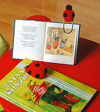 A plüsskaticával díszített széles gumival még a gyerekkezek is egy mozdulattal a borítóhoz tudják fogni a már elolvasott oldalakat, s utána a kis pettyes bogárka együtt pihenhet a könyvvel. Az óriási gemkapocsra varrt katica pedig egyszerűen a lapokra tűzhető.