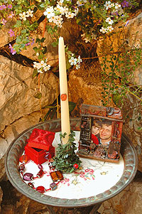 Válasszunk különböző vastagságú, fehér vagy vajszínű gyertyákat. Helyezzük a viaszrudakat gyertyatartóra, kis tálkára, majd vegyük körbe különféle girlandokkal: fogjunk össze 1-1 m készen kapható buxus- és borostyánfüzért, lazán tekerjük fel gyűrűformára, egymásba bújtatva, fűzve a szálakat, a végét pedig hagyjuk lelógni. Elszórtan díszítsük csipeszre ragasztott és öntapadós hátú katicabogarakkal. (A csipeszes katicák az apró levelű indákhoz, az öntapadós hátú bogárkák pedig nagyobb levelekhez ideálisak.) A fa gyertyatartók azért is jók, mert a levelekkel harmonizáló színű akrillal le is festhetjük őket. Ha a gyertyatartó teteje túl keskeny a girlandhoz, vágjunk alá zöld kartonlapból papírgyűrűt. A gyertyákat szalvétából kivágott katica-mintákkal is díszíthetjük, amelyeket dekupázsragasztóval vagy speciális gyertyaalapozóval és -lakkal simíthatjuk a sima felületre.