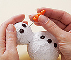 Szemnek és gombnak tűzzünk fel egy-egy fekete flittert gombostűvel. A répaorrot süthető gyurmából formázzuk meg, melybe még sütés előtt illesszünk fejével befelé egy gombostűt. Kiégetés után a gombostűt a gömbbe szúrjuk, így illeszthetjük a helyére az orrot. Ezután már csak az öltöztetés van hátra: kapjanak sapkát és meleg sálat fázós hóembereink!