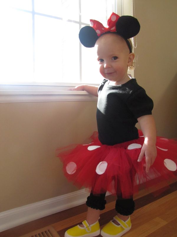 A tütü elkészítéséhez annyit kell csak varrni, hogy a gyermek derékméretéhez igazítva összevarrjuk pár öltéssel a nadrágguminkat. A tüll anyagot tetszőleges hosszúságú csíkokra vágjuk, a csíkokat rácsomózzuk a gumira szorosan egymás mellé. A fehér filcből köröket vágunk ki, és random módon, elszórtan ráragasztjuk őket a tüllszoknyára. Minnie Mouse-füleket lehet venni készen is, de ha mi magunk szeretnénk készíteni azt is, akkor a fekete hajpántra fekete filc anyagból duplán hajtva, ráragasztva pompás füleket kaphatunk. Ha maximalisták vagyunk, akkor sárga cipőket is készítünk a jelmezhez, ehhez sárga filc anyagra és egy használaton kívül helyezhető csajos cipőre lesz csak szükségünk, amire a filcet ráragasztjuk.