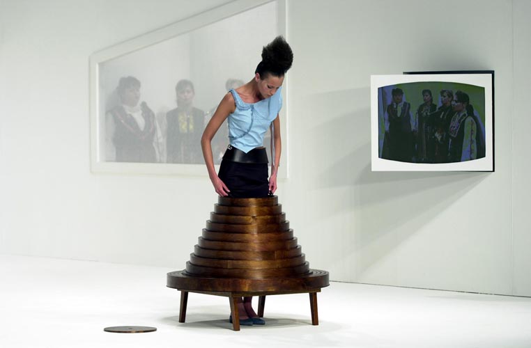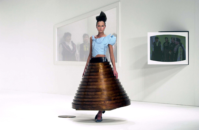 Hussein Chalayan brit-ciprusi divattervező kreációja az asztal és a szoknya bizarr szerelemgyereke, az asztalszoknya, vagy szoknyaasztal. Leülni mondjuk garantáltan nem lehet benne. Cserébe viszont kétségkívül látványos. Valamit valamiért.