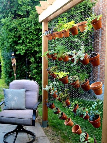 Egészen pazar látvány a drótokra rögzített cserepekből készített függőleges kert. Ehhez a megoldáshoz mindenképpen könnyű és kisebb méretű műanyag cserepeket javaslunk, hogy a paravánra erősített drótkerítés elbírja azok súlyát.