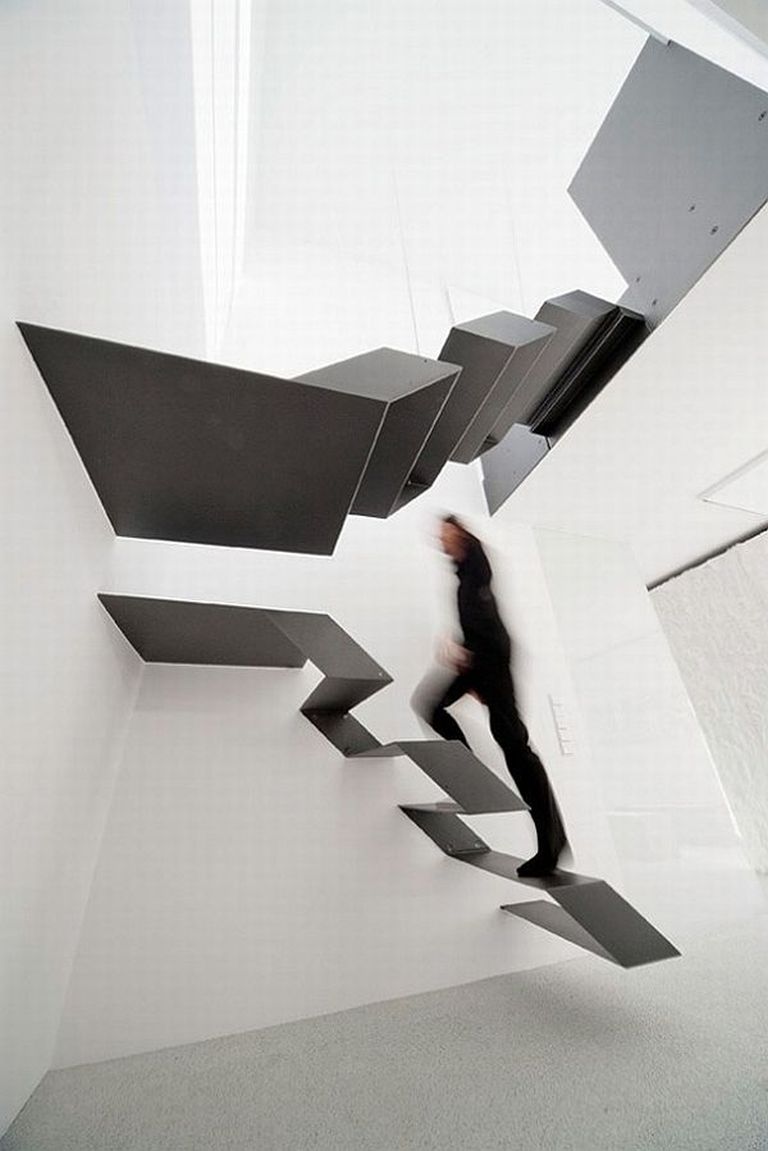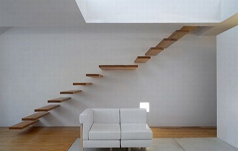 Iszonyú jól néznek ki ezek a lebegni látszó lépcsők, de nem véletlenül csak kevesen folyamodnak házépítéskor hasonló megoldáshoz. Nehéz szabadulni az érzéstől, hogy véletlenül a semmibe lépünk lépcsőzés közben, főleg ha még korlát sincsen. Egy élmény lehet kicsi gyereket nevelni egy ilyen lakásban.