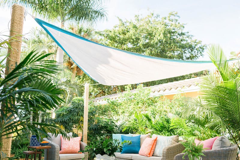 2. A háromszög alakú ponyva tökéletes választás egy kültéri nappali fölé: