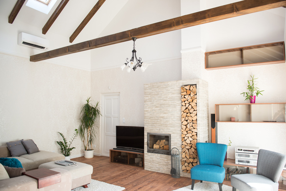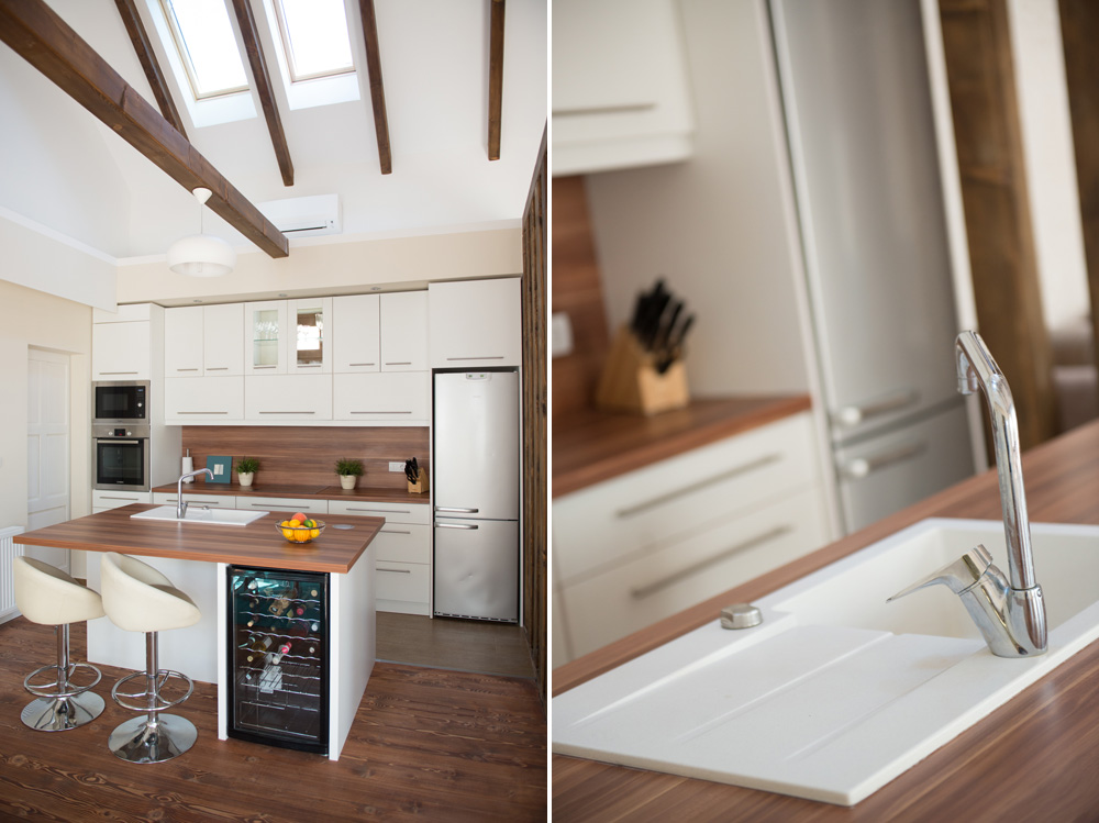 A letisztult bútorok mellett a házban olyan modern és fiatalos elemeket is észrevehetünk, mint a színes kábelek – Évi azt mondja, a szülei odáig vannak értük, imádják a hangulatot, amit árasztanak. Egy gerendaházat a fa tesz különlegessé, éppen ezért a konyha-ebédlő-nappali térben meghagyták a látszó gerendákat, és a földre hajópadló került. Mindenhol máshol gipszkartonnal borították a falakat, amelyeket különböző tapétákkal fedtek, hiszen Évi és az édesanyja is rajong a csodaszép mintákért, színekért.