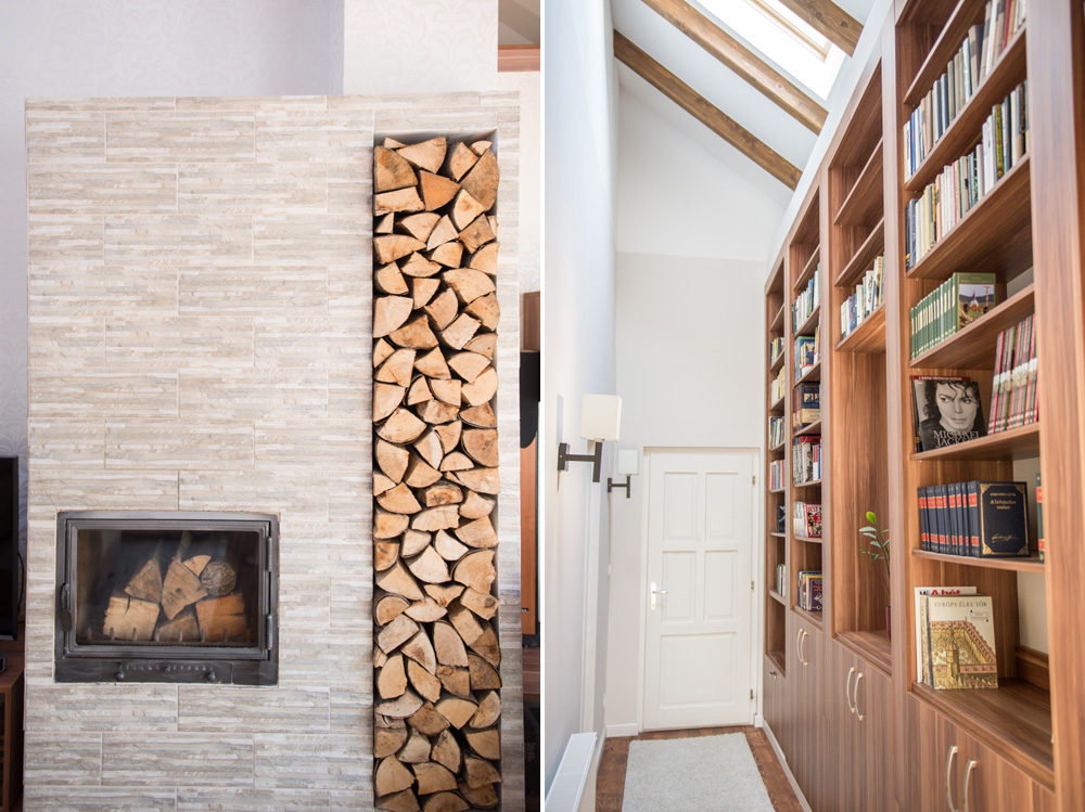 „Az alapkoncepció az volt, hogy tágas és világos terek legyenek a házban. A folyosókon nincs mennyezet, látszanak a tetőgerendák, ez még tágasabbá teszi a teret, az összes többi helyiségben van.” A ház másik fontos eleme a könyves folyosó, amely Évi anyukájának régi vágya volt. Így nemcsak lett helyük a könyveknek, de szépen díszítik is a folyosót. A folyosót tetőablakok teszik még világosabbá.