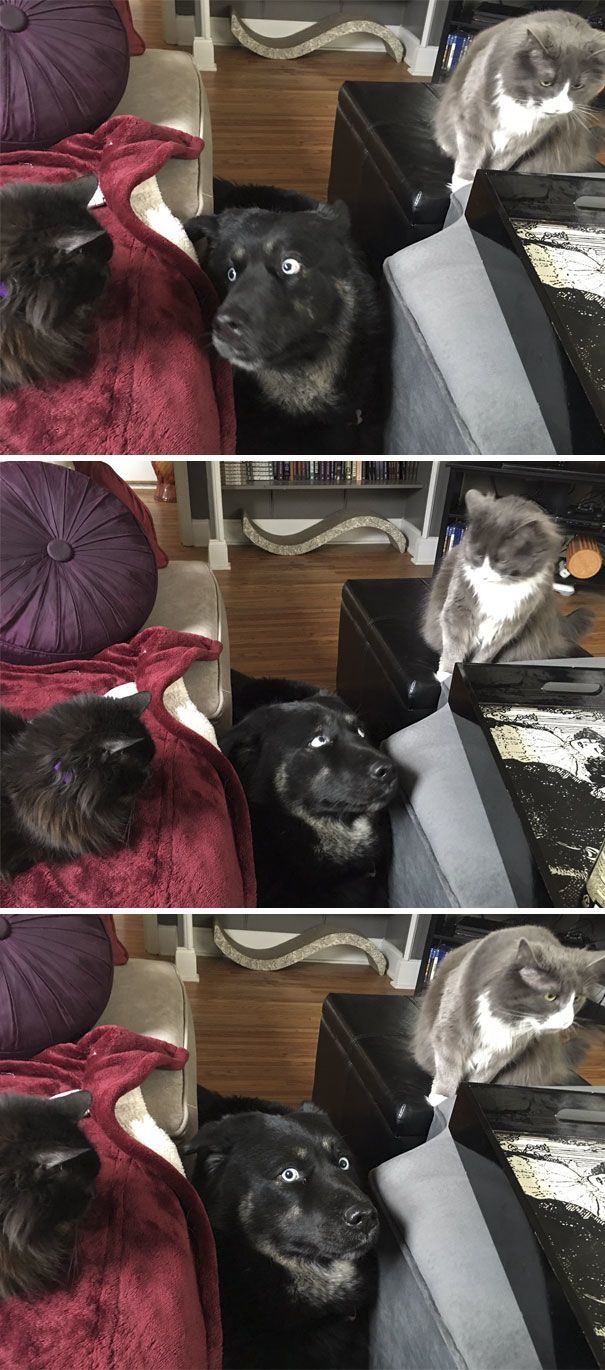 A most következő képek azt is bebizonyítják, hogy a dominancia dinamikája is eléggé változó: van, ahol a nagytestű kutyák tartják félelemben a cicákat, de simán megesik, hogy egy ravasz macska uralma alá hajtja a kutyákat. Mindenesetre senki ne dőljön be a látsznak: ők valójában mind nagyon jó barátok!