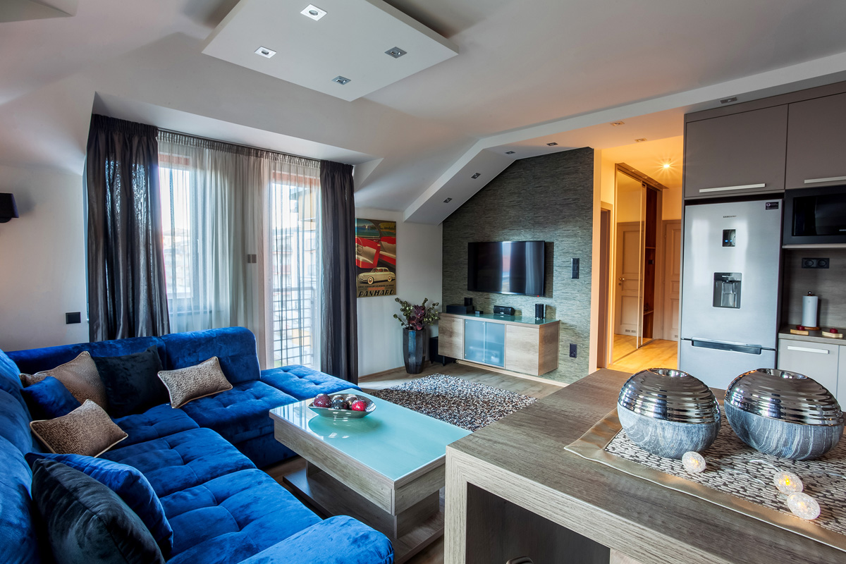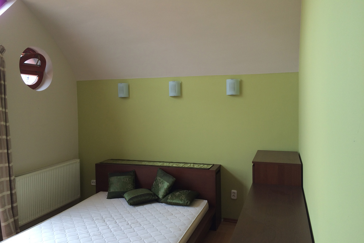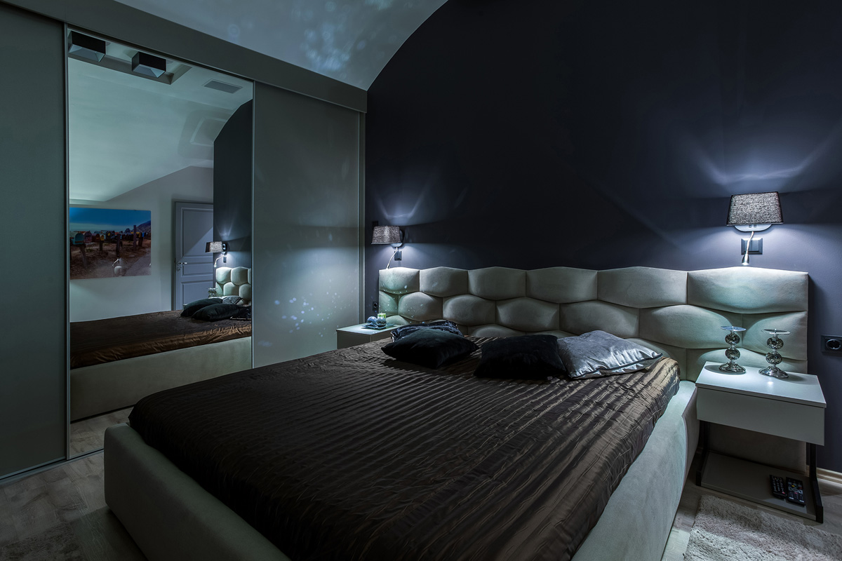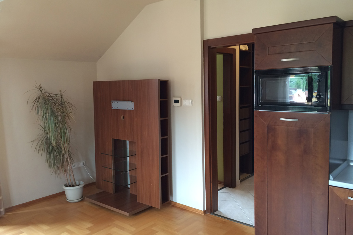 A konyhában nagyon sok a rejtett fiók és tároló. A hálószobában hatalmas gardróbszekrénynek jutott hely, a terasz ajtó feletti ablakot elfedték, hogy a nappalit lehessen árnyékolni.