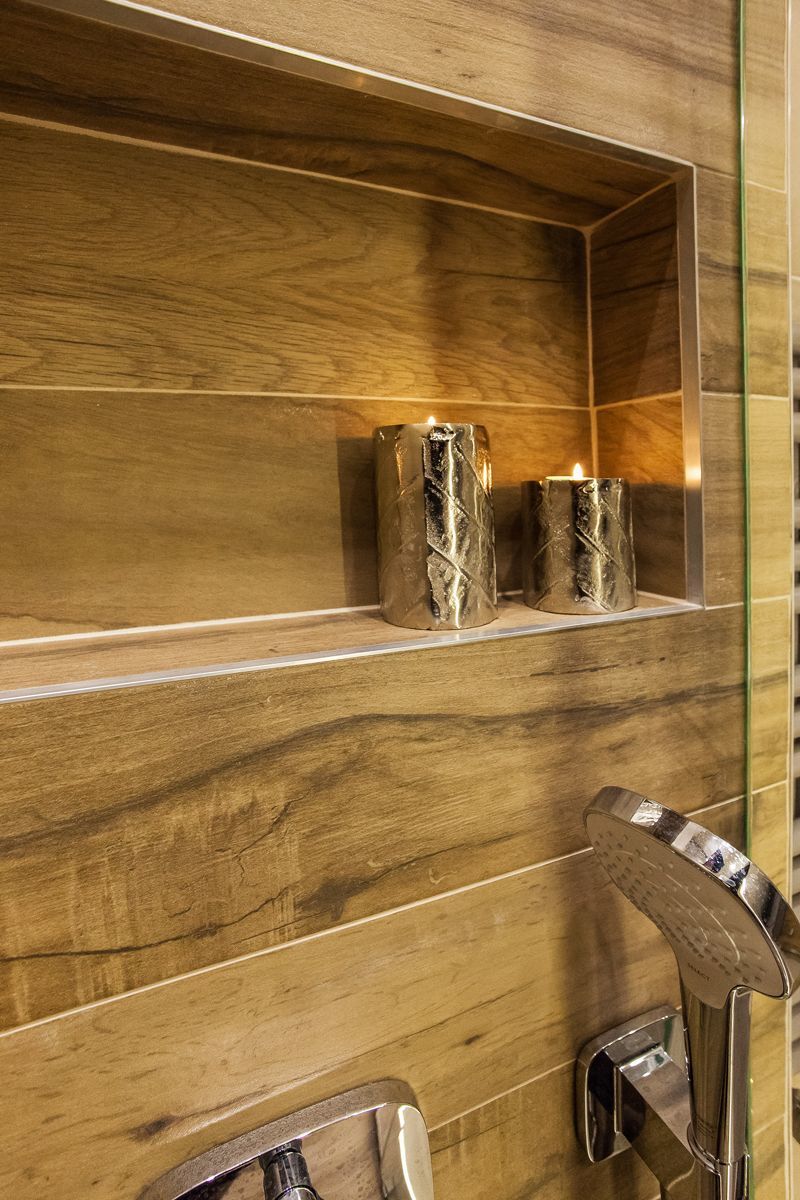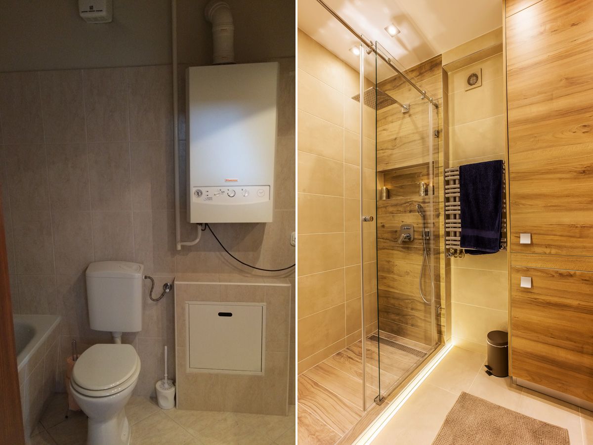 A fürdőszoba nagyon kicsi és zsúfolt volt, ezért a legtöbb átalakításon a fürdőszoba esett át. Itt eredetileg 4 négyzetméteren egy miniatűr kád, WC, mosdó és cirkó is be lett zsúfolva. A WC-t helyett egy zuhanyfülkét alakítottak ki. A beépített szekrénybe rejtették a cirkót, amely körül tárolóhelyeket kerültek. A mosdó alatt szennyes tartó és pipere fiókok is elfértek. Természetesen a világításnak is fontos szerepe volt itt, hogy vizuálisan növelje a pici és sötét teret.