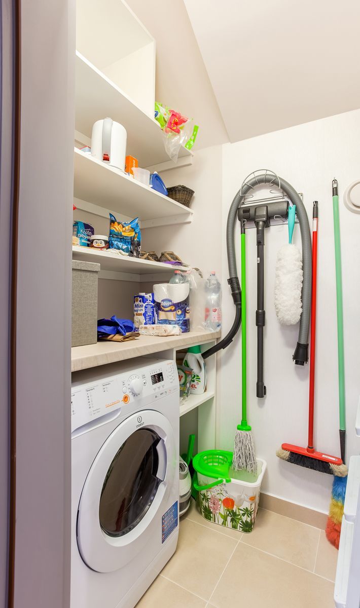 A mosó- és szárítógépek egy mosókonyhába kerültek, a nem napi szinten használt háztartási berendezések pedig az előszobát a hálószobától elválasztó nagy gardróbszekrénybe. A bejárattól jobbra található falba mélyesztettek egy kis cipőtároló szekrényt.