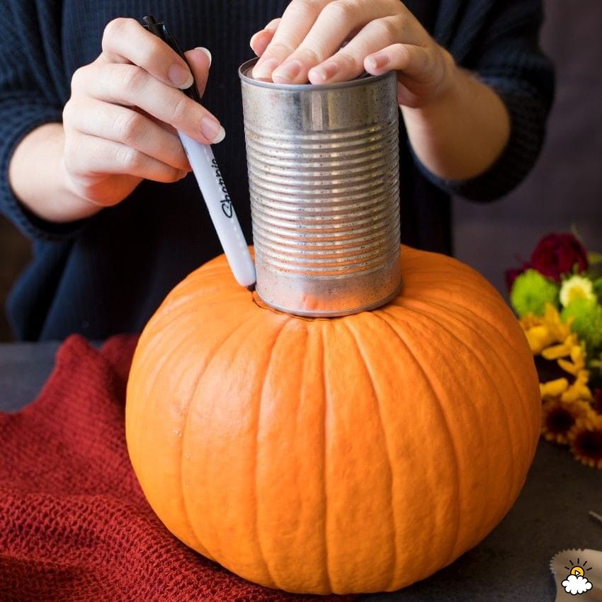 Rajzold körbe a dobozt a sütőtök tetején. Fontos, hogy megfelelő nagyságú legyen a sütőtököd, hogy biztosan beleférjen a doboz.