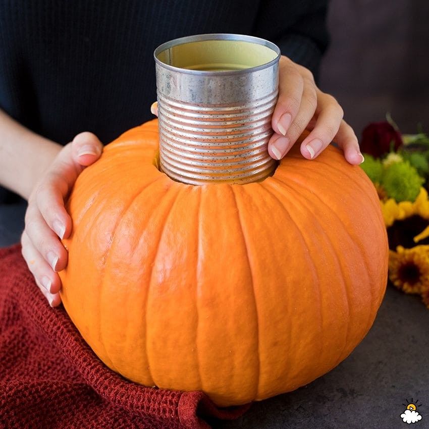 Tedd bele a dobozt a sütőtökbe. Ha túl kicsi a lyuk, óvatosan szélesítsd ki a lyuk szélét.