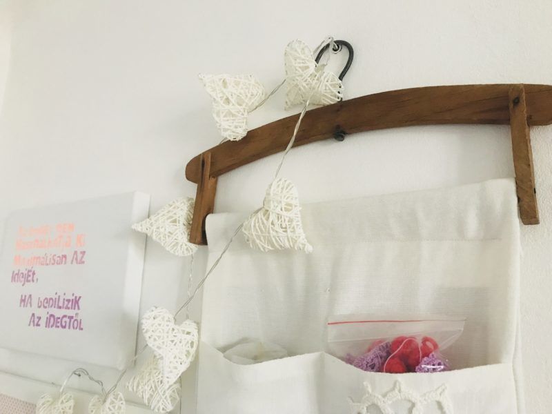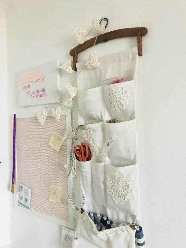 Most jöjjön a kedvenc részem, a falitároló. Ez tulajdonképpen egy szupertrendi újrahasznosított cucc. A régi vállfát anyu találta egy szekrény aljában, és szinte azonnal teljesen egyértelmű volt, hogy mi lesz belőle. Talátunk otthon vastag anyagot, ami elég masszív, hogy tároló legyen, én leadtam a rendelést, „anyuműhely” pedig gyorsan meghorgolta a díszeket, és összerakta. Szerintem gyönyörű lett, és tele van zsebekkel, amikben minden munkaeszközöm elfér, sőt még alul egy cérnatároló részlegem is lett benne, ami nagyon menő.