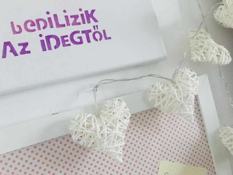 Szeretem az égősorokat, olyan hangulatossá teszik a helyeket. Természetes, hogy itt is van, nem is akármilyen, egy kis fonott szívecskés, amit a barátnőmtől kaptam. Tökéletesen passzol a horgolt tárolóhoz. A tábla fölött pedig helyet kapott egy kis kép, amit én készítettem. Szintén a barátnőmtől kaptam egy sablonkészletet, amiben az ábrák mellett mindenféle betűk is vannak, azzal írtam festővászonra egy nagyon hasznos Stephen King-idézetet. Nem árt bizonyos helyzetekben emlékeztetni magamat. Igen, tudom, kicsit összevissza, de nekem így tetszik, a színátmenetes tollal együtt.
