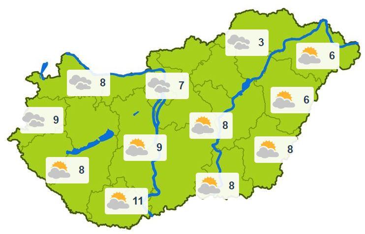 Pénteken az ország északi felén felhősebb lesz az ég, délen süthet ki hosszabb időre a nap. Csapadék nem várható. A szél a Dunántúlon megélénkül, néhol meg is erősödik. A legalacsonyabb hőmérséklet mínusz 5 és plusz 3 fok között alakul, a Dunántúlon lesz enyhébb a hajnal. Napközben általában 7-13, az ország északkeleti harmadán viszont csak 1-6 fokig melegszik a levegő.