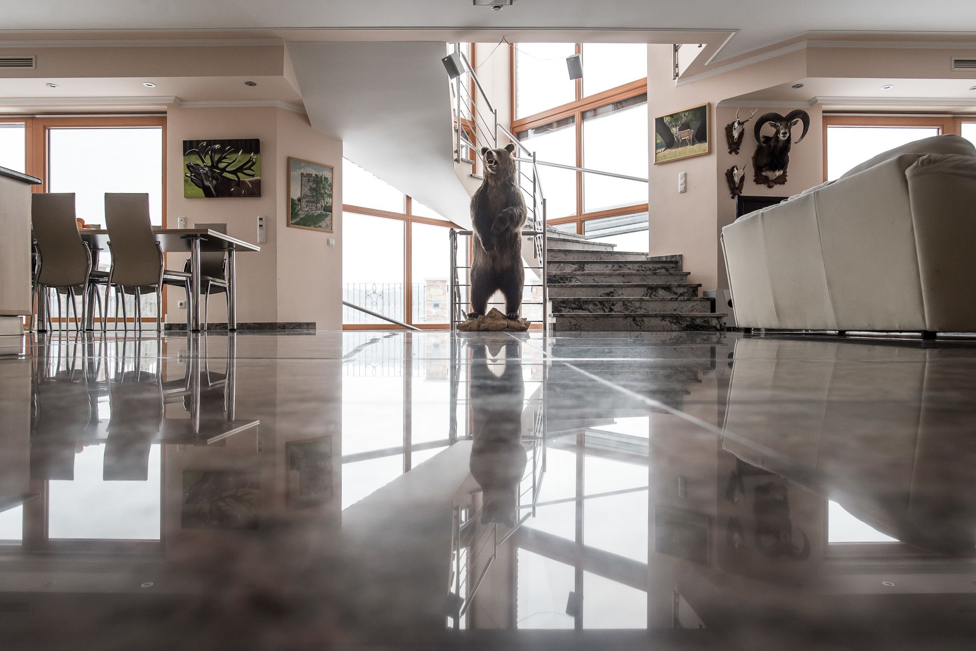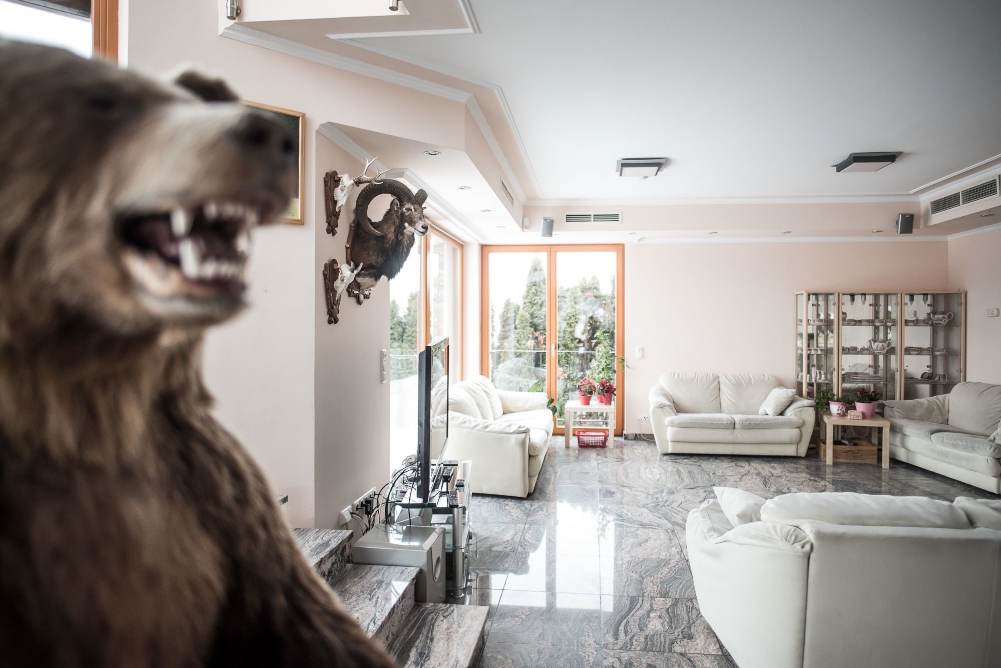 „Imádja a gránitot, éppen ezért minden burkolat abból készült. A férjem egyik hobbija a vadászat, ezért velünk lakik néhány medve is, meg agancsok, mindegyiket természetesen ő terítette le. Az alagsorban van még egy közös tér, a gyerekek ott tudnak pingpongozni télen-nyáron, illetve ott kapott helyet a férjem italgyűjteménye is. Amikor az anyukám nálunk alszik, akkor az ottani hálószobában és fürdőszobában lakik.