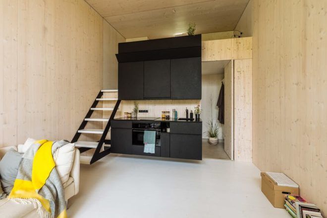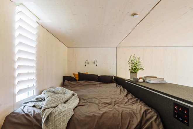 A ház alapterülete ugyan kicsi, a nagy belmagasságnak hála mégis kellemes térérzetet nyújt. Az alsó szinten nappali, konyha, fürdő és terasz található, a felső szint pedig egy magas galéria, ahol az átlagos termetűek a fejüket sem verik be a plafonba.
