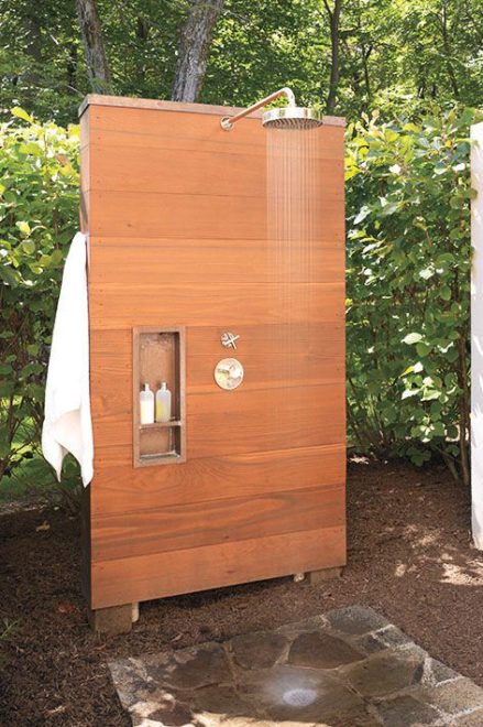 Frank Webb kültéri zuhanyzóját világos cédrusfából készült fal választja el a kíváncsi szemek elől.
