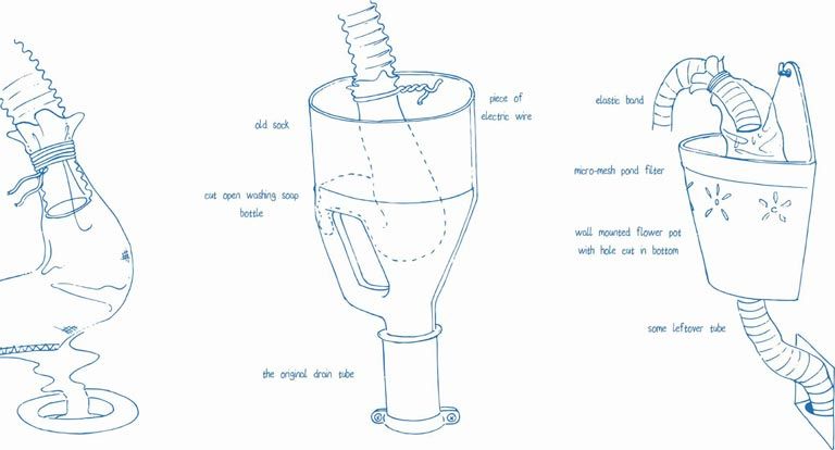 Desnerck az ötletét FIYLTER-nek nevezte el, ami egy ügyes szójáték: a barkácsolók kedvenc betűszavát, a DIY-t (do it yourself – csináld magad) és a FILTER-t, vagyis a szűrőt házasította össze. Ahogy az alábbi ábrán is látható, némi PVC-csőre, egy mosószeres flakonra, kevés rézdrótra és egy régi zoknira lesz hozzá szükség. Ezenkívül egy dolgot kell beszerezni, ami valószínűleg nincs minden háztartásban: egy darab műanyag szűrőhálót, amelyet barkácsboltokban vagy medencetisztító felszerelést árusító üzletben fogunk megtalálni.