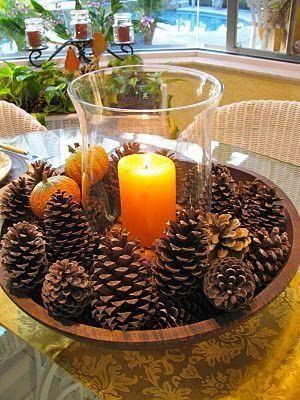 Szuper egyszerű, mégis nagyon hangulatos asztaldísz. Csak egy fatál, egy nagyobb gyertya és néhány toboz kell hozzá.