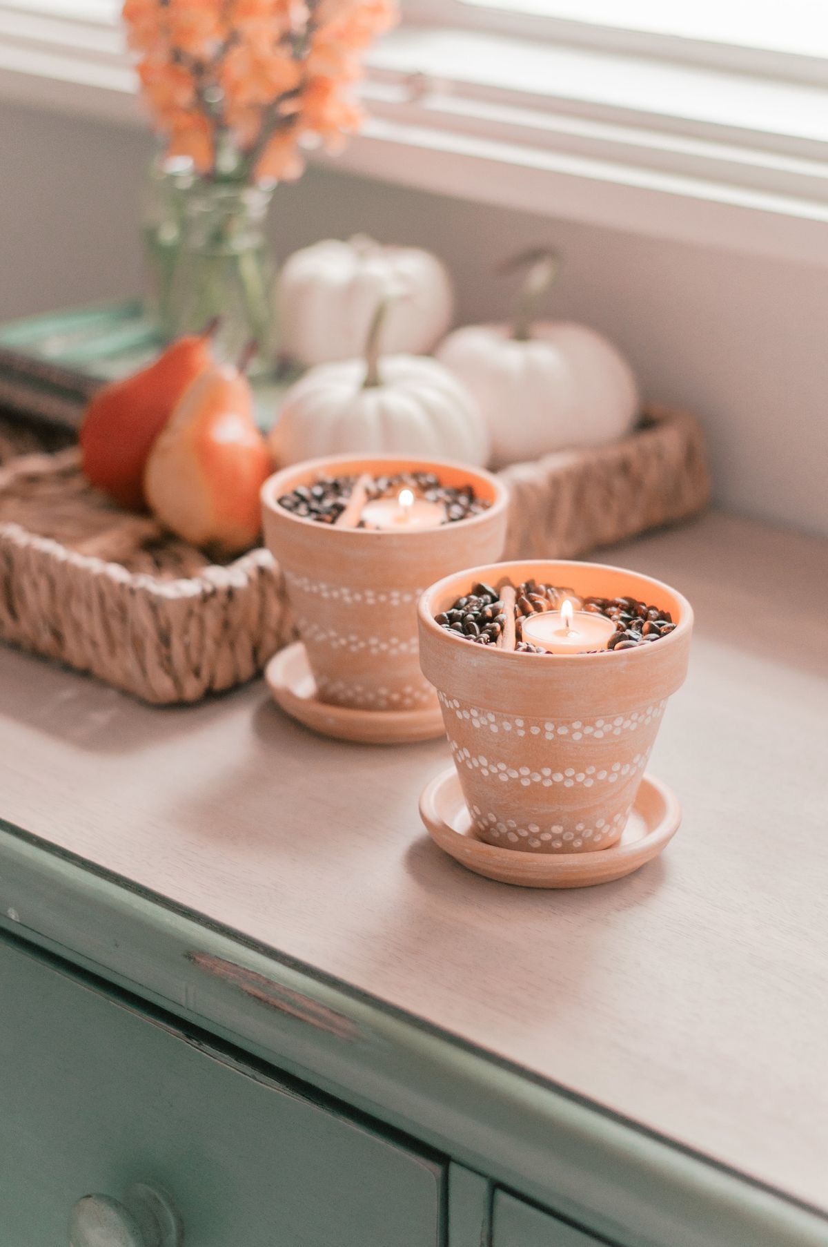 Kis cserepekből pedig aranyos mécsestartókat készíthetsz. Csak töltsd meg a cserepeket kávéval és fűszerekkel, majd tegyél bele mécsest, így kész is az illatos díszed.