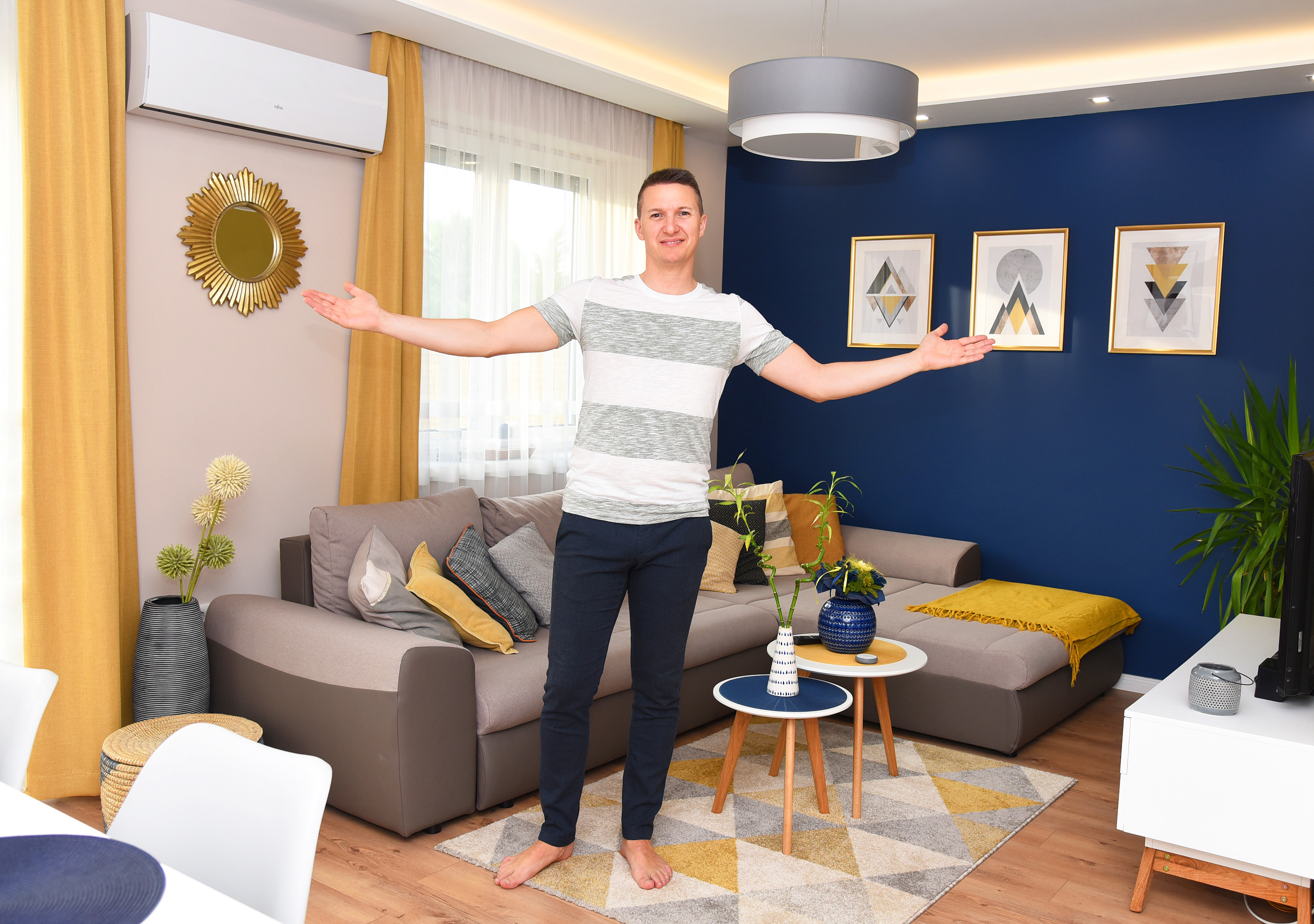 „Két háló és fürdő, konyha, nappali, tároló és két kisebb kert: ez a mi házunk. Minden pénzünk ráment, de nem bánjuk, mert a végeredmény magáért beszél. A falon lévő képeket én terveztettem egy internetes oldalon látott fotó alapján. A tölgyfából készült bútorokat együtt választottuk, a konyha viszont Brigi terepe volt, hiszen imád főzni. A vásárlásnál a mustársárga, az arany és a kék különböző árnyalatai közül válogattunk, kissé skandináv stílusú lett az összkép. Az itt élők többsége velünk egykorú, gyerekes család, ebből akadóan a hangulat miatt sem panaszkodhatunk” – mesélte büszkén az énekes a BEST-nek.