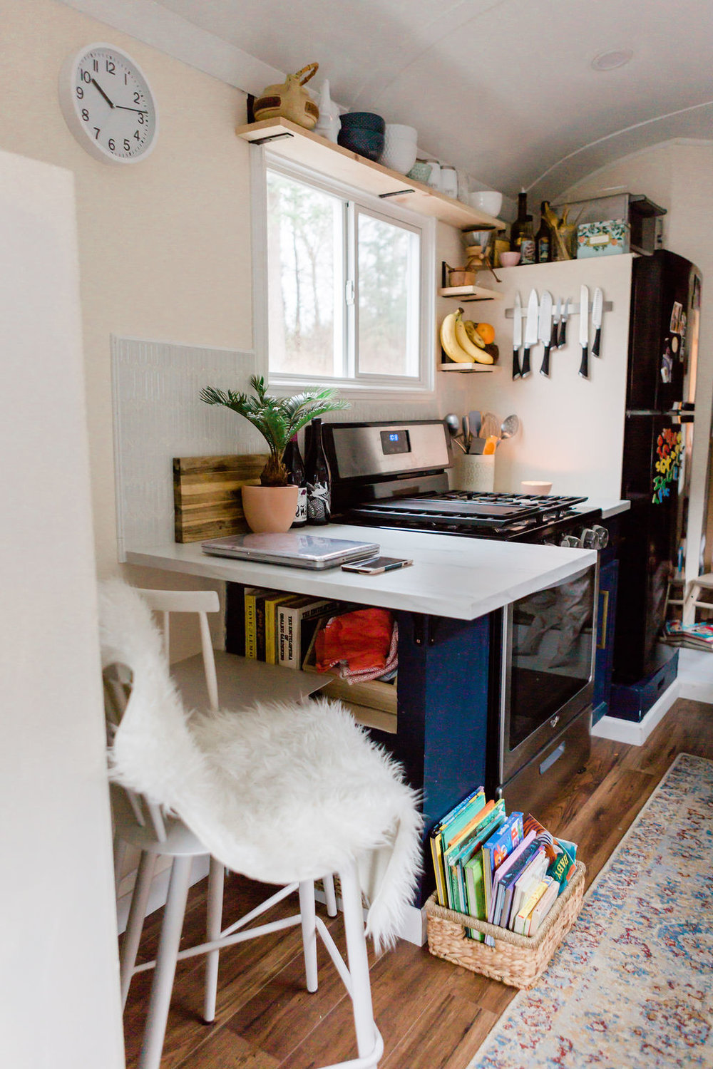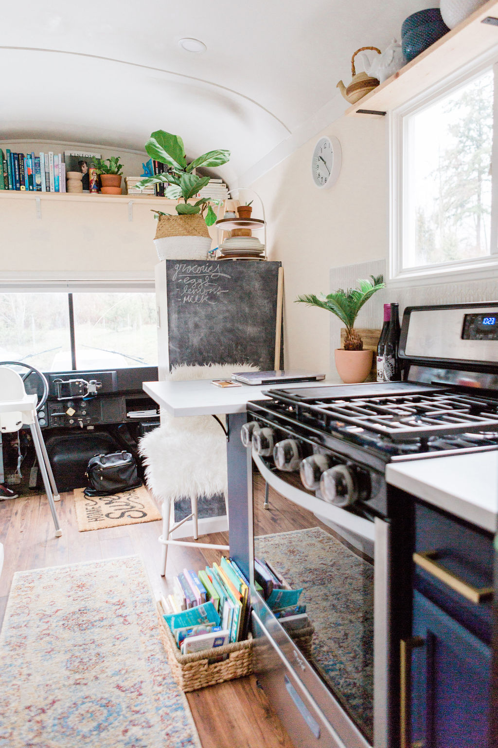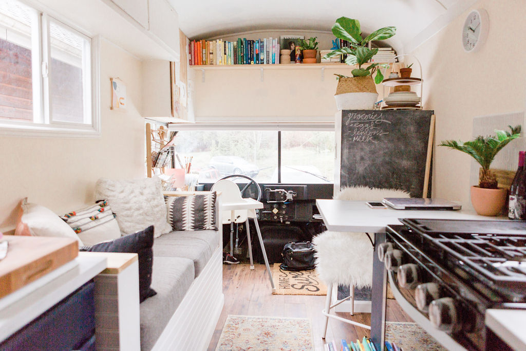 A modern, minimalista otthonban 1 évig tartott az átalakítás. A 200 négyzetméteres iskolabuszból lett otthonban még gyerekszoba is található. Az édesanya legkedvesebb helyisége a fürdőszoba lett, mert világos és tágas, és fürdőkád is van benne.