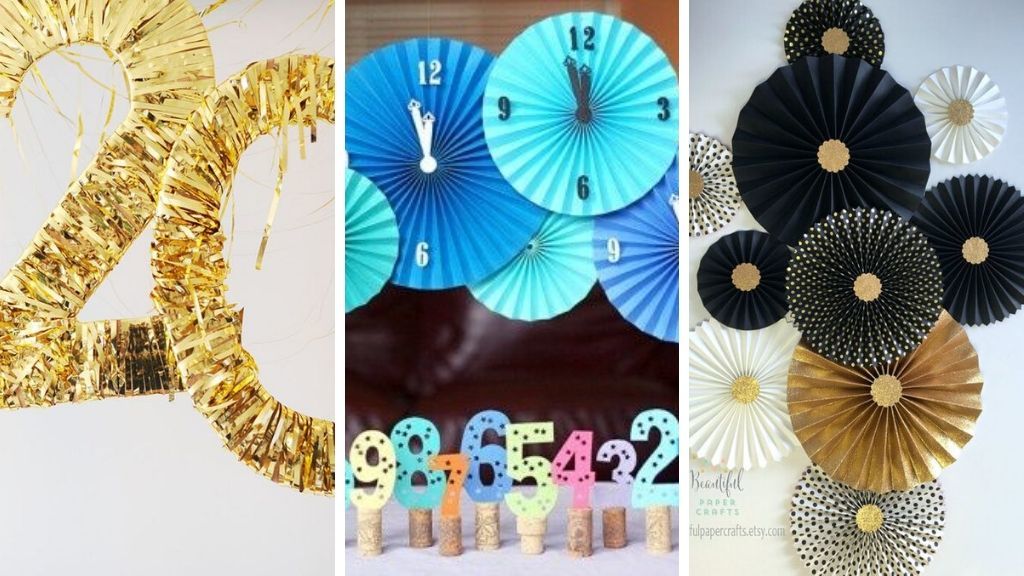 Vágj ki vastag kartonpapírból évszámokat, amiket aztán betekersz a karácsonyfára is feltehető vékony, csillogó szalagokkal. Régi pezsgősüvegekre ragassz számokat, és hajtogass szép színes és fényes papírból falra akasztható, kör alakú dekorációkat!