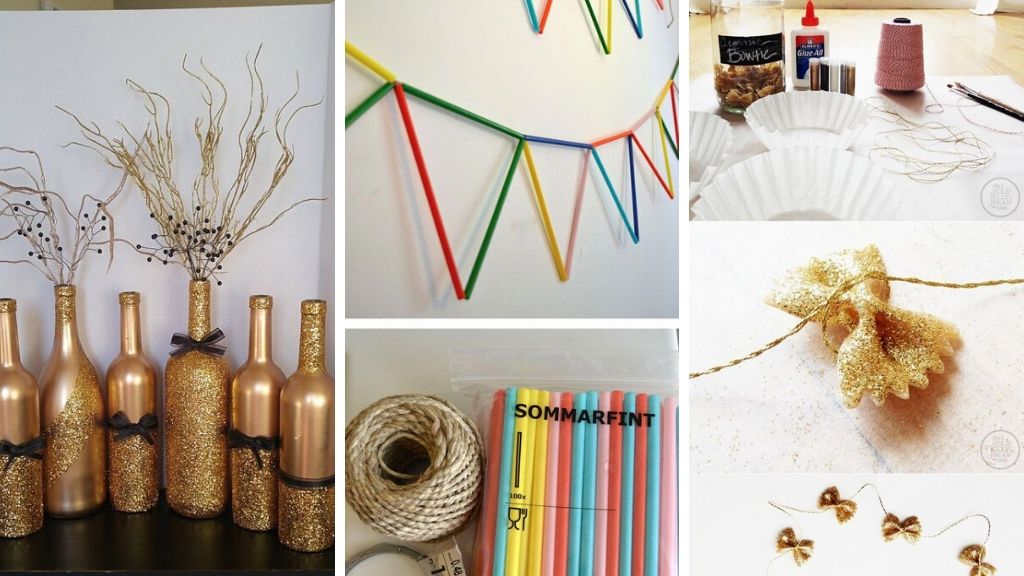 A régi boros és pezsgősüvegeidet befújhatod metálszínű festékkel, de kerülhet rá glitteres díszítés is. A régi szívószálaid most új életet kaphatnak fali dekorációként! A tészták is használhatók dekorációs elemként, csak fújd le őket glitter spray-vel, és fűzd fel őket. Az asztalra is teheted dekorációs elemként a csillogó masnitésztákat!