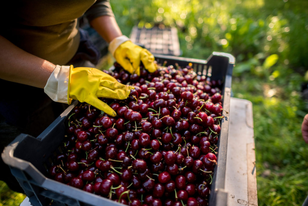 Sérült meggyszemeket válogat egy szüretelő egy palkonyai meggyültetvényen (Fotó: MTI / Sóki Tamás)