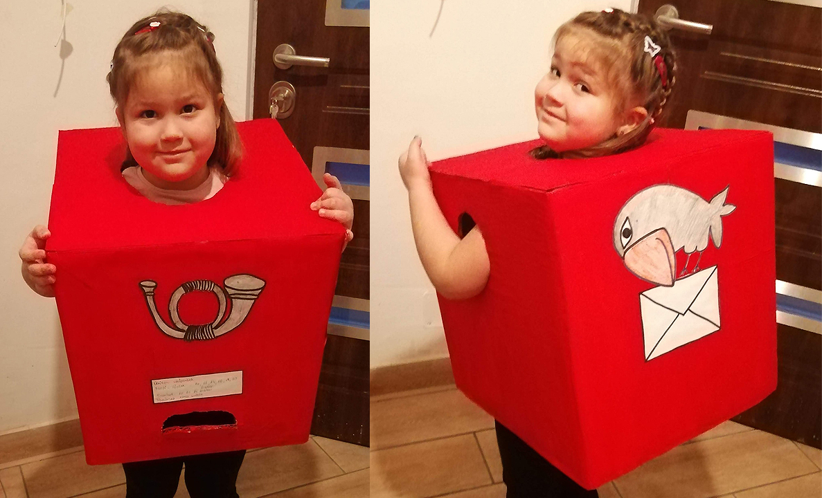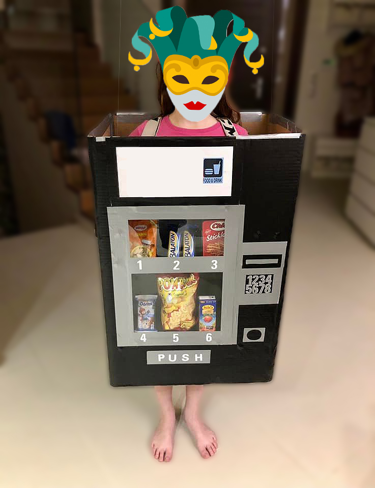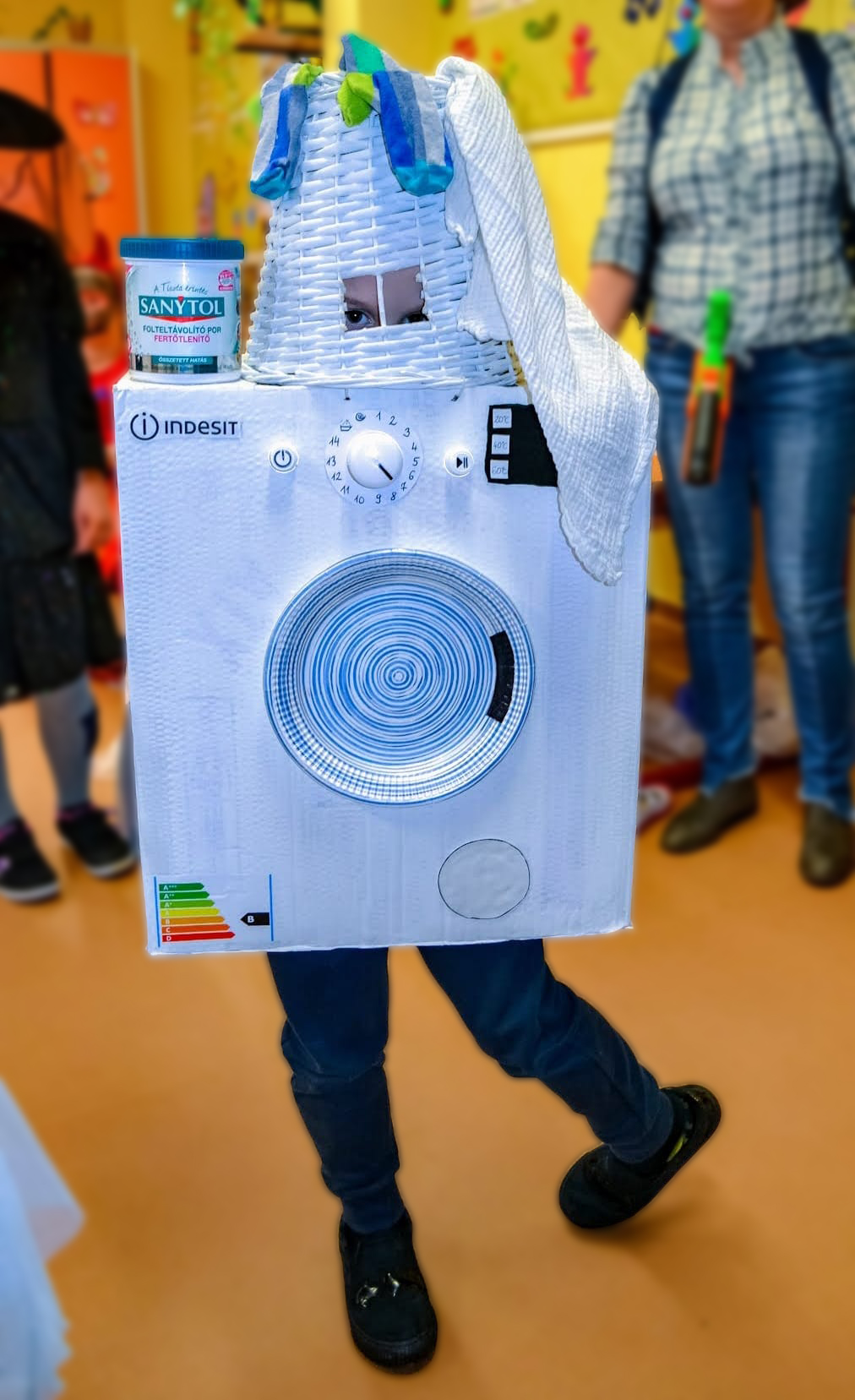 A kreativitás azonban itt nem áll meg. Mint – számomra legalábbis – kiderült, a különféle automaták közkedvelt témák a gyerekek körében, többen is megosztották parkolóautomatás, ital- vagy ételautomatás jelmezek fotóit, melyek mellett a dobozból bármit kategória egy szuper ötlete volt a piros postaláda jelmez is, amit Alíz készített kislányának és a mosógép jelmez, ami Melinda kisfiának volt az álma.