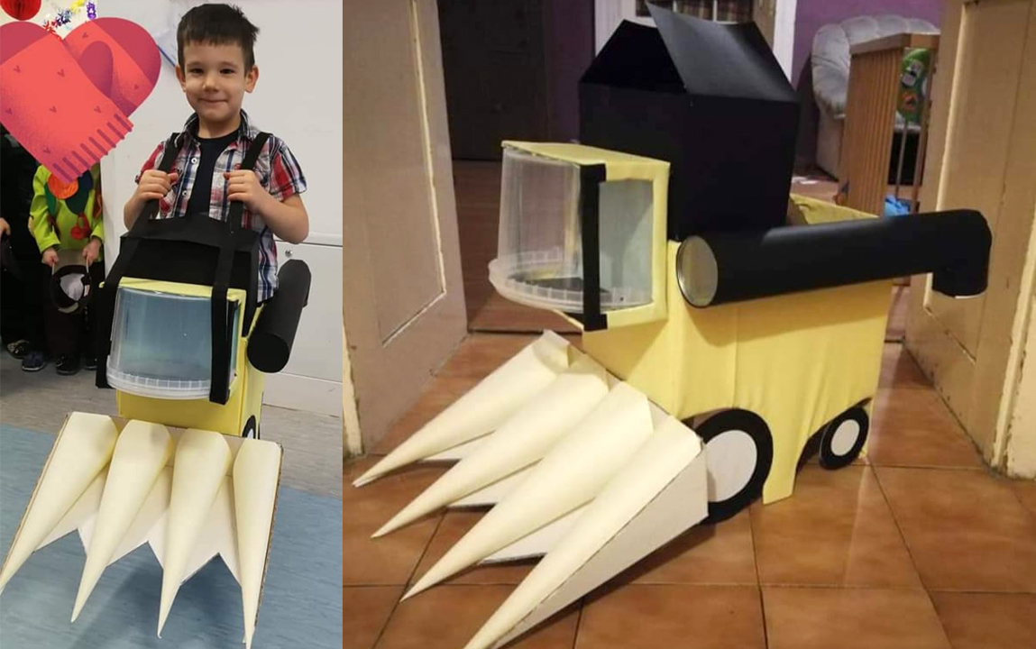 Ha doboz van, minden van. Egy jó kartondobozból készülhet bármilyen járgány mozdonytól a kombájnig, mint Zsuzsannáéknál, ahol az is kikötés volt, hogy sárga legyen. „1-2 nap küzdelem árán, de apával közösen végül összeraktuk a kombájnt egy halom felesleges dologból. Pelenkás dobozból, nápolyis vödörből, chipszes hengerből.”