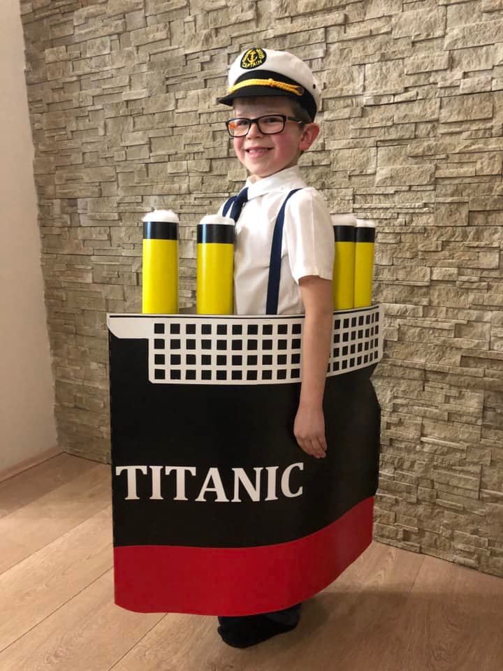 Hajóskapitánynak öltözni jó ötlet, de mi történik, ha a fiad egy egész óceánjárónak szeretnek öltözni? „Kisfiam óriási Titanic rajongó. Előző évben a karantén ideje alatt volt időm elkészíteni neki a Titanic jelmezt, aminek hihetetlenül örült. – mesélte Éva – Az iskolának képeket kellett küldeni az itthon bemutatott jelmezekről, úgy értékelték őket. Díjat is kapott később a legkreatívabb jelmezért, amitől szintén nagyon boldog volt.”