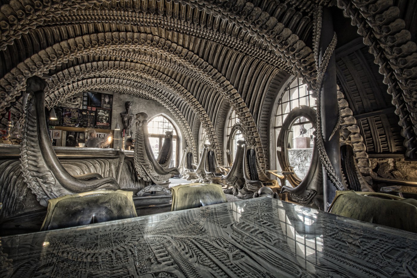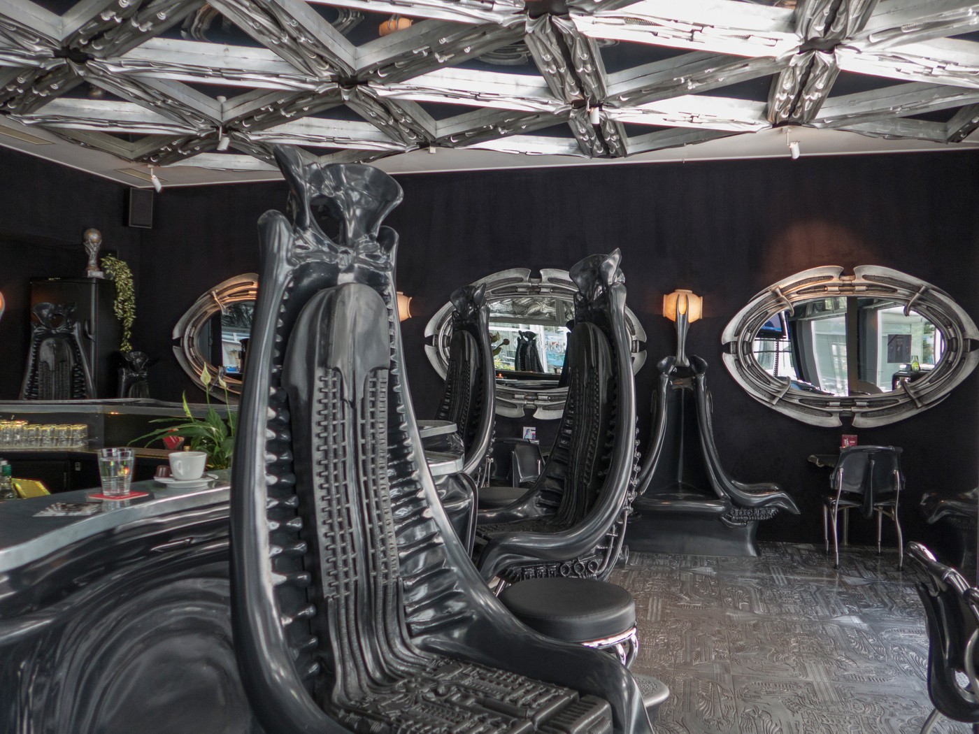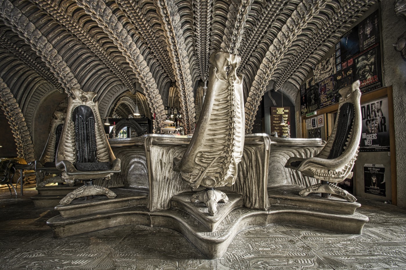 Egyfajta zarándokhellyé vált az a svájci bár, amit Hans Giger, az Alien mozifilmek speciális effektusáért Oscar-díjat nyert képzőművésze tervezett. A H.R. Giger Múzeum néven működő hely 1998-ban nyitotta meg kaputi a látogatók előtt és a mai napig borzongatja a Ridley Scott rajongókat. Giger az összes franchise-on dolgozott, beleértve a későbbi Predator filmeket is. A múzeum egy 400 éves középkori kastélyban található, melynek kétméter vastag falai között barangolhatunk a barlangszerű, csigolyaíves-csontvázas termekben. A mennyezet, a falak, a padló, a szerelvények, az asztalok és a székek mind a művész egyedi, a Bolygó neve halál vagy a Prometheus filmekből már jól ismert földöntúli díszletet idézik meg. Giger azt szerette volna, ha mi is átéljük azt az élményt, amikor egy idegen civilizáció nyomaira bukkanunk, egy letűnt kor maradványaival.