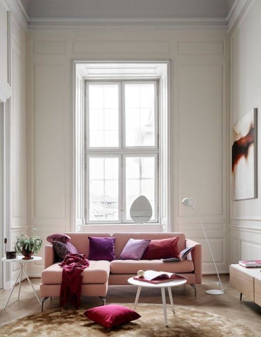 Ha szeretnénk meghittebbé tenni a nappalit, válasszunk pasztellszíneket, mint amilyenben ez a rózsaszín kanapé is játszik.